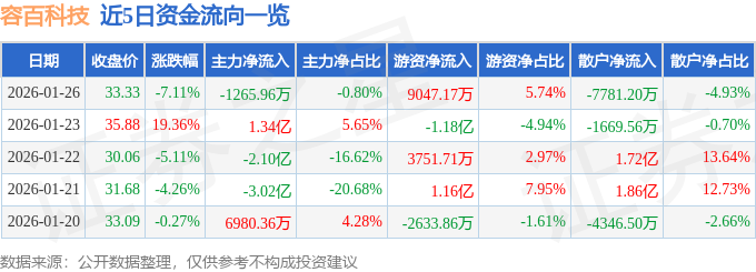 证券之星消息,截至2026年1月26日收盘,容百科技(688005)报收于33.33元,下跌7.11%,换手率6.46%,成交量46.18万手,成交额15.77亿元。