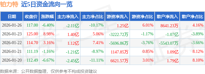 证券之星消息,截至2026年1月26日收盘,铂力特(688333)报收于117.0元,下跌6.4%,换手率6.34%,成交量17.4万手,成交额20.78亿元。