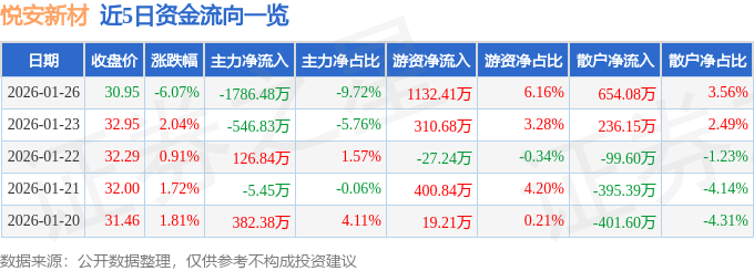 证券之星消息,截至2026年1月26日收盘,悦安新材(688786)报收于30.95元,下跌6.07%,换手率4.09%,成交量5.88万手,成交额1.84亿元。