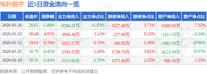 证券之星消息,截至2026年1月26日收盘,电科数字(600850)报收于28.65元,下跌5.88%,换手率4.4%,成交量29.92万手,成交额8.7亿元。