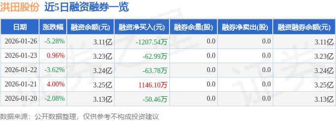 证券之星消息,截至2026年1月26日收盘,洪田股份(603800)报收于47.93元,下跌5.28%,换手率3.36%,成交量6.99万手,成交额3.42亿元。