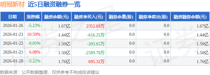 证券之星消息,截至2026年1月26日收盘,明冠新材(688560)报收于21.37元,下跌5.23%,换手率13.45%,成交量27.07万手,成交额6.07亿元。