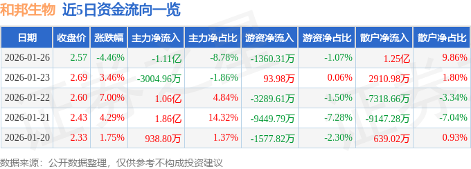 证券之星消息,截至2026年1月26日收盘,和邦生物(603077)报收于2.57元,下跌4.46%,换手率5.49%,成交量484.55万手,成交额12.68亿元。