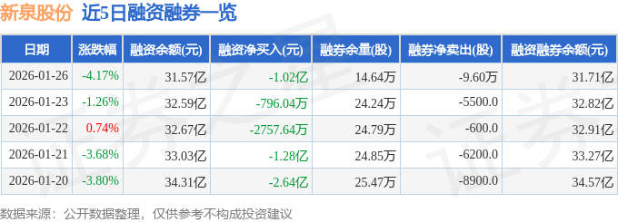 新泉股份融资融券信息显示,融资方面,当日融资买入1.8亿元,融资偿还2.81亿元,融资净偿还1.02亿元。融券方面,融券卖出2600.0股,融券偿还9.86万股,融券余量14.64万股,融券余额1341.19万元。融资融券余额31.71亿元。
