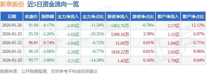 证券之星消息,截至2026年1月26日收盘,新泉股份(603179)报收于91.6元,下跌4.17%,换手率3.81%,成交量19.42万手,成交额17.91亿元。