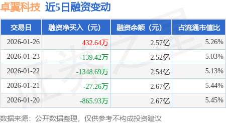 证券之星消息,1月26日,卓翼科技(002369)融资买入1125.3万元,融资偿还692.66万元,融资净买入432.64万元,融资余额2.57亿元。