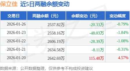 证券之星消息,1月26日,保立佳(301037)融资买入373.43万元,融资偿还393.77万元,融资净卖出20.33万元,融资余额2537.82万元。