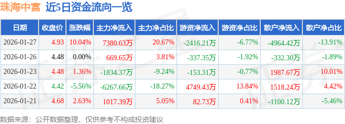 证券之星消息,截至2026年1月27日收盘,珠海中富(000659)报收于4.93元,上涨10.04%,换手率6.0%,成交量77.09万手,成交额3.57亿元。