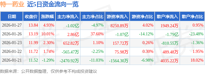 证券之星消息,截至2026年1月27日收盘,特一药业(002728)报收于13.84元,上涨4.93%,换手率39.84%,成交量150.12万手,成交额20.51亿元。