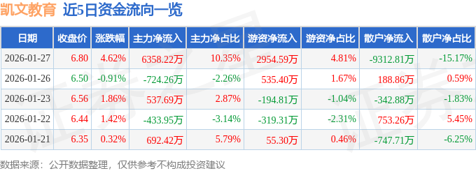 证券之星消息,截至2026年1月27日收盘,凯文教育(002659)报收于6.8元,上涨4.62%,换手率15.01%,成交量89.8万手,成交额6.14亿元。