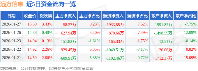证券之星消息,截至2026年1月27日收盘,远方信息(300306)报收于15.39元,上涨3.43%,换手率10.73%,成交量16.91万手,成交额2.57亿元。