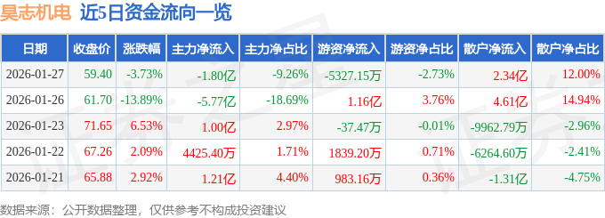 证券之星消息,截至2026年1月27日收盘,昊志机电(300503)报收于59.4元,下跌3.73%,换手率13.59%,成交量32.76万手,成交额19.48亿元。