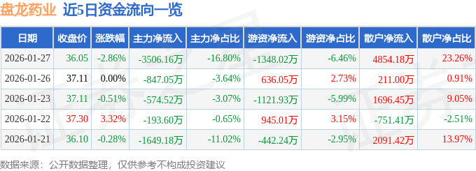 证券之星消息,截至2026年1月27日收盘,盘龙药业(002864)报收于36.05元,下跌2.86%,换手率7.83%,成交量5.81万手,成交额2.09亿元。