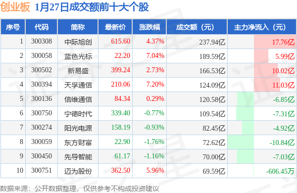 当日创业板成交额前10大个股中6只个股收涨,平均涨幅4.6%,其中中际旭创(300308)以成交额237.94亿元排第一。从主力资金流入看,成交额前10大个股中有4只个股呈现主力资金净流入。