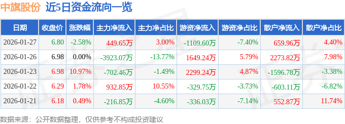证券之星消息,截至2026年1月27日收盘,中旗股份(300575)报收于6.8元,下跌2.58%,换手率6.45%,成交量22.11万手,成交额1.5亿元。