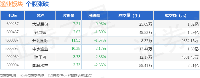 证券之星消息,1月27日渔业板块较上一交易日下跌1.82%,国联水产领跌。当日上证指数报收于4139.9,上涨0.18%。深证成指报收于14329.91,上涨0.09%。渔业板块个股涨跌见下表: