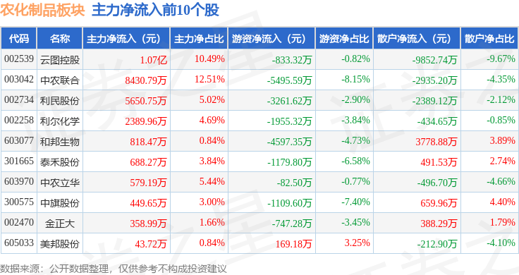 从资金流向上来看,当日农化制品板块主力资金净流出14.81亿元,游资资金净流出70.22万元,散户资金净流入14.82亿元。农化制品板块个股资金流向见下表: