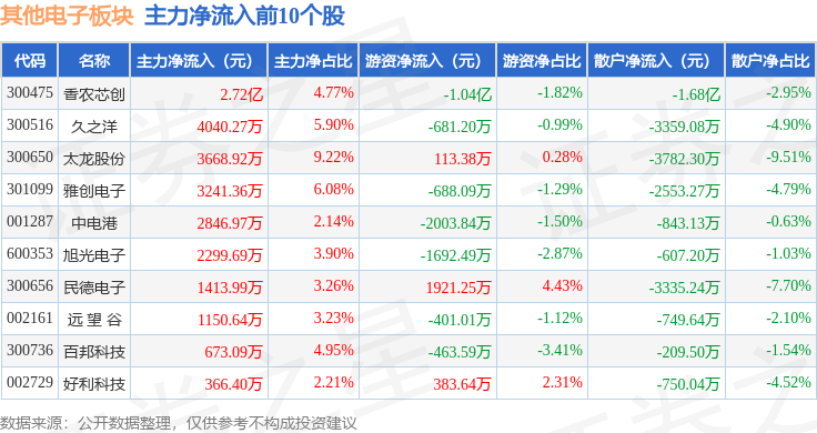 从资金流向上来看,当日其他电子板块主力资金净流出2.16亿元,游资资金净流出4986.92万元,散户资金净流入2.66亿元。其他电子板块个股资金流向见下表: