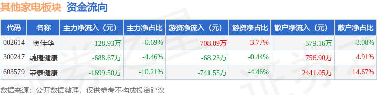 从资金流向上来看,当日其他家电板块主力资金净流出2517.1万元,游资资金净流出101.69万元,散户资金净流入2618.8万元。其他家电板块个股资金流向见下表: