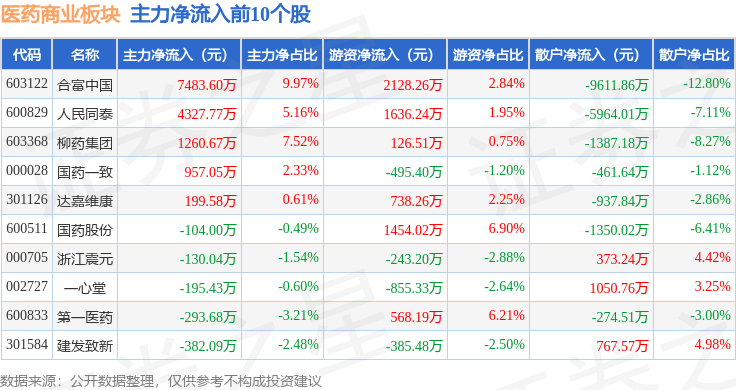 从资金流向上来看,当日医药商业板块主力资金净流出5.19亿元,游资资金净流入1.91亿元,散户资金净流入3.28亿元。医药商业板块个股资金流向见下表: