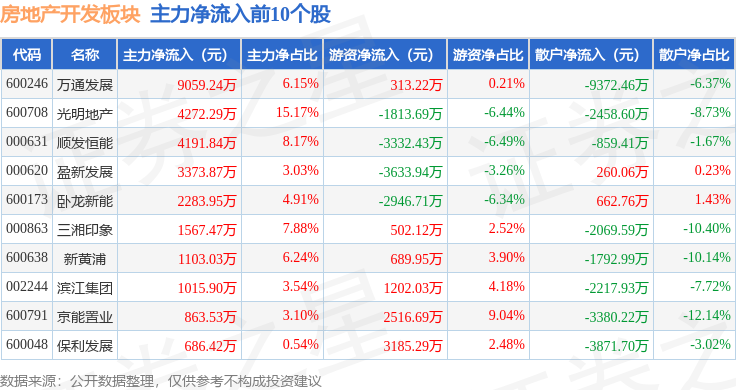 从资金流向上来看,当日房地产开发板块主力资金净流出8.52亿元,游资资金净流入1.73亿元,散户资金净流入6.79亿元。房地产开发板块个股资金流向见下表: