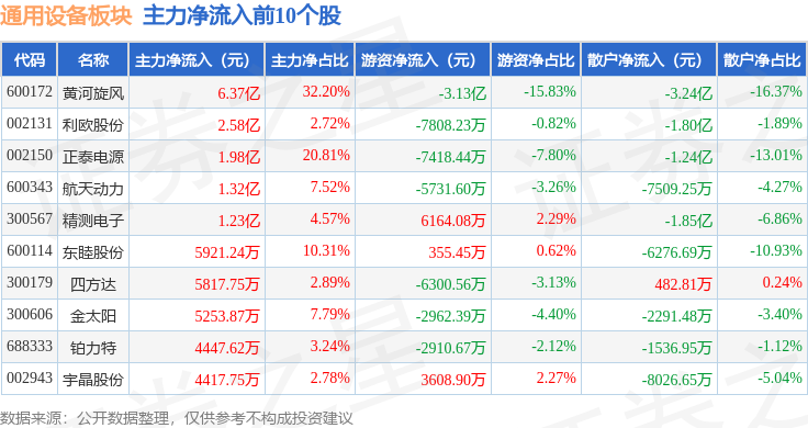 从资金流向上来看,当日通用设备板块主力资金净流出11.47亿元,游资资金净流出7.52亿元,散户资金净流入18.98亿元。通用设备板块个股资金流向见下表: