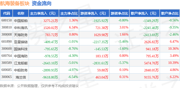 从资金流向上来看,当日航海装备板块主力资金净流出1.18亿元,游资资金净流出4062.99万元,散户资金净流入1.58亿元。航海装备板块个股资金流向见下表: