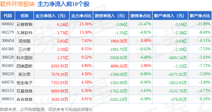 从资金流向上来看,当日软件开发板块主力资金净流出4.74亿元,游资资金净流出3.5亿元,散户资金净流入8.24亿元。软件开发板块个股资金流向见下表: