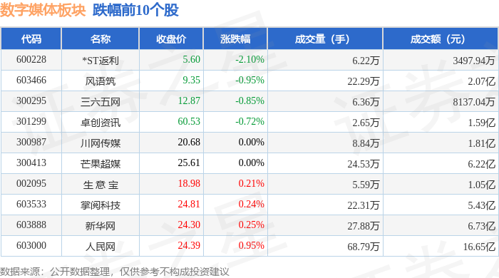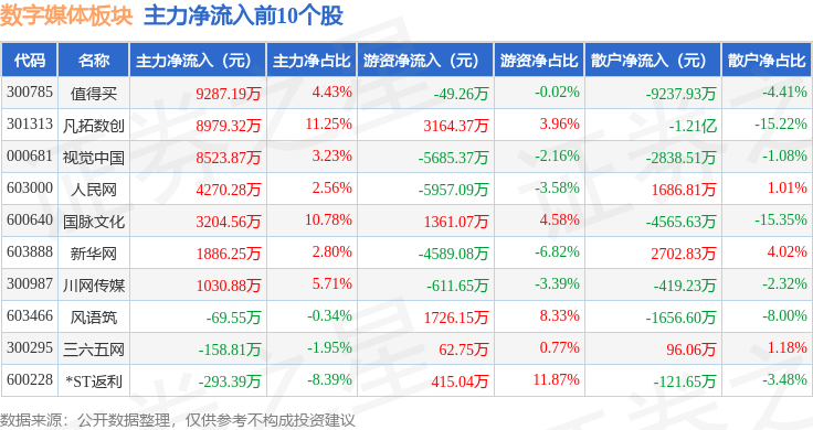 从资金流向上来看,当日数字媒体板块主力资金净流入3.16亿元,游资资金净流出6717.94万元,散户资金净流出2.48亿元。数字媒体板块个股资金流向见下表: