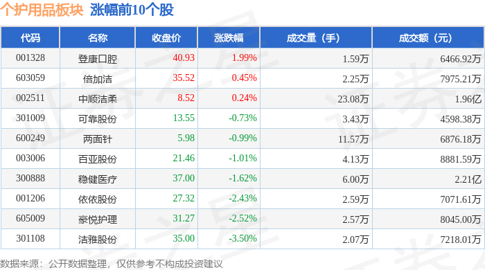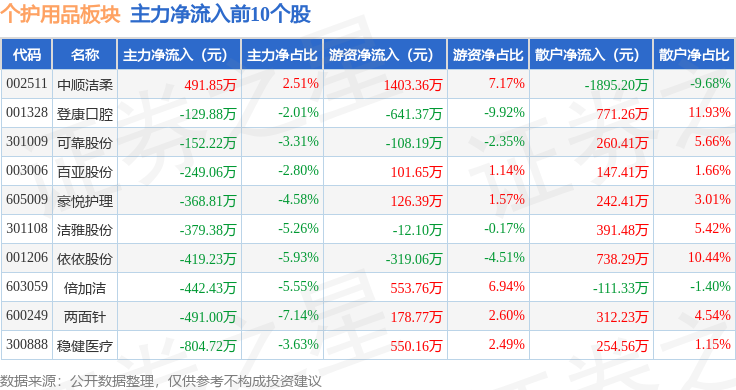 从资金流向上来看,当日个护用品板块主力资金净流出7308.64万元,游资资金净流出1210.24万元,散户资金净流入8518.89万元。个护用品板块个股资金流向见下表:
