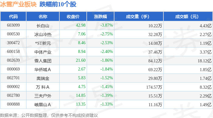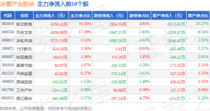 从资金流向上来看,当日冰雪产业板块主力资金净流出2.63亿元,游资资金净流入8604.21万元,散户资金净流入1.77亿元。冰雪产业板块个股资金流向见下表: