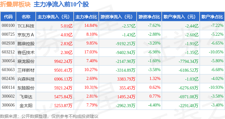 从资金流向上来看,当日折叠屏板块主力资金净流出3.54亿元,游资资金净流出5868.54万元,散户资金净流入4.13亿元。折叠屏板块个股资金流向见下表: