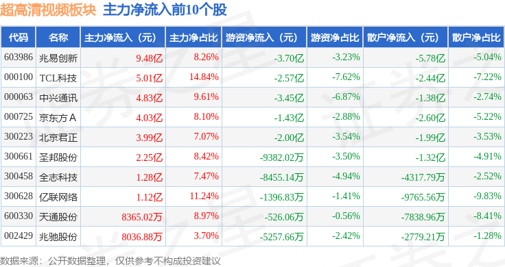 从资金流向上来看,当日超高清视频板块主力资金净流入10.6亿元,游资资金净流出7.69亿元,散户资金净流出2.91亿元。超高清视频板块个股资金流向见下表: