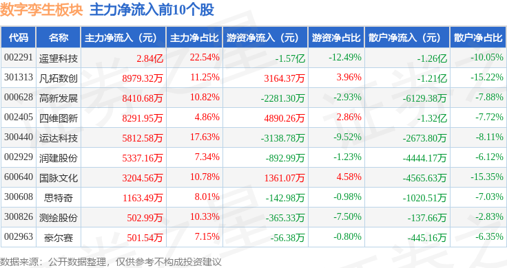从资金流向上来看,当日数字孪生板块主力资金净流出4.92亿元,游资资金净流入6294.22万元,散户资金净流入4.29亿元。数字孪生板块个股资金流向见下表: