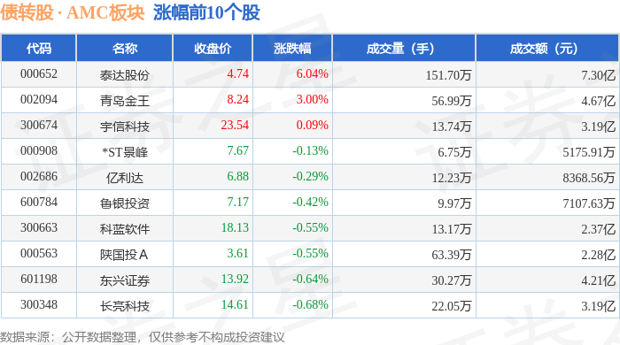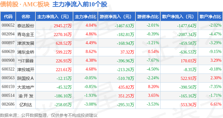 从资金流向上来看,当日债转股 · AMC板块主力资金净流出6.36亿元,游资资金净流入7037.25万元,散户资金净流入5.66亿元。债转股 · AMC板块个股资金流向见下表: