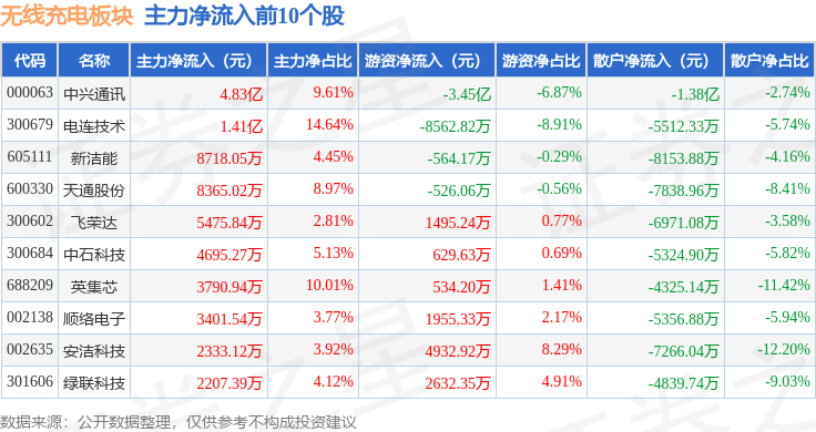 从资金流向上来看,当日无线充电板块主力资金净流出6.43亿元,游资资金净流入1923.32万元,散户资金净流入6.23亿元。无线充电板块个股资金流向见下表: