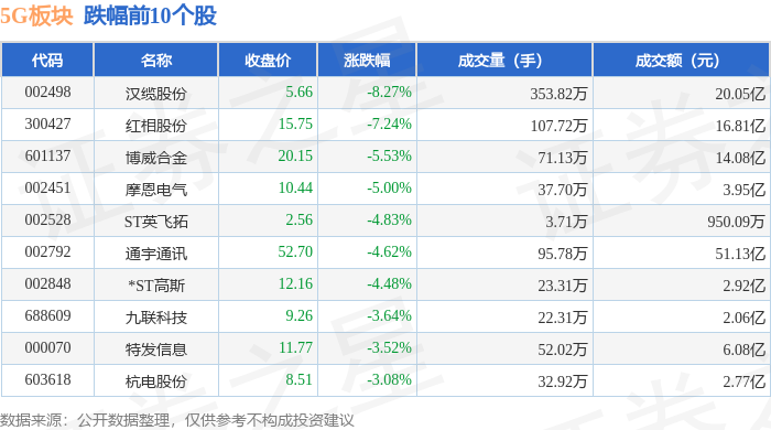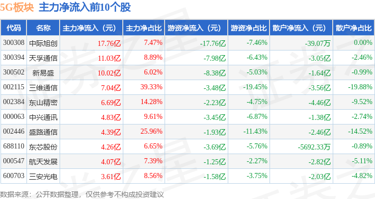 从资金流向上来看,当日5G板块主力资金净流入27.55亿元,游资资金净流出48.44亿元,散户资金净流入20.89亿元。5G板块个股资金流向见下表: