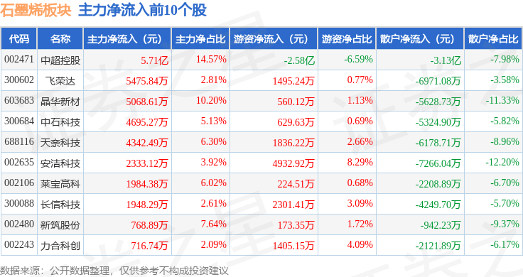 从资金流向上来看,当日石墨烯板块主力资金净流出17.69亿元,游资资金净流入3.13亿元,散户资金净流入14.56亿元。石墨烯板块个股资金流向见下表: