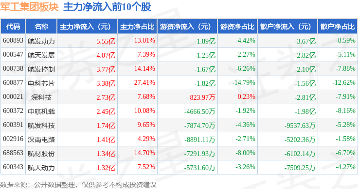 从资金流向上来看,当日军工集团板块主力资金净流入2.3亿元,游资资金净流出7.45亿元,散户资金净流入5.15亿元。军工集团板块个股资金流向见下表: