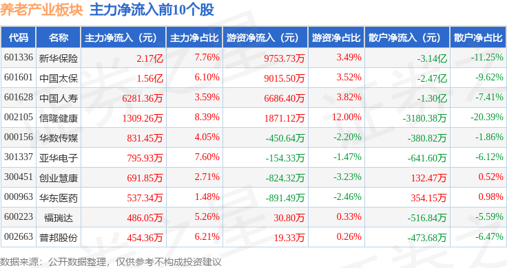 从资金流向上来看,当日养老产业板块主力资金净流出11.84亿元,游资资金净流入5.22亿元,散户资金净流入6.62亿元。养老产业板块个股资金流向见下表: