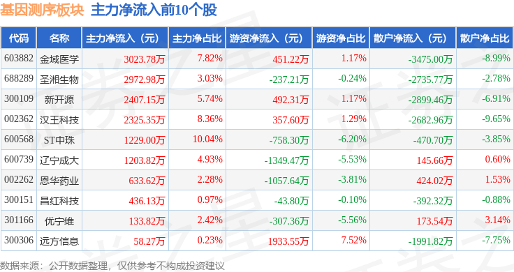 从资金流向上来看,当日基因测序板块主力资金净流出13.62亿元,游资资金净流入3.35亿元,散户资金净流入10.27亿元。基因测序板块个股资金流向见下表: