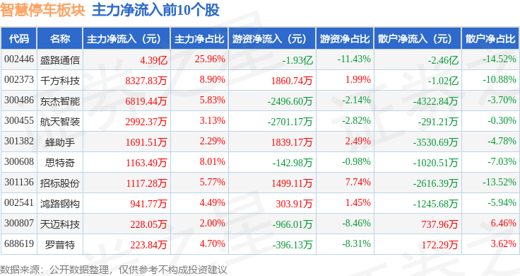 从资金流向上来看,当日智慧停车板块主力资金净流出1.05亿元,游资资金净流出7436.52万元,散户资金净流入1.79亿元。智慧停车板块个股资金流向见下表: