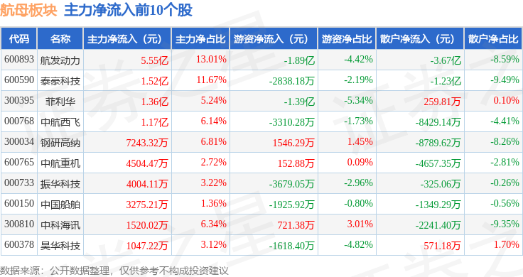 从资金流向上来看,当日航母板块主力资金净流入4.69亿元,游资资金净流出4.57亿元,散户资金净流出1248.79万元。航母板块个股资金流向见下表: