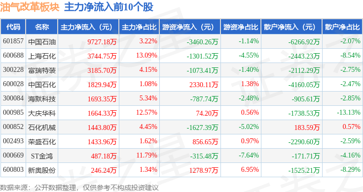 从资金流向上来看,当日油气改革板块主力资金净流出13.75亿元,游资资金净流入4.24亿元,散户资金净流入9.51亿元。油气改革板块个股资金流向见下表: