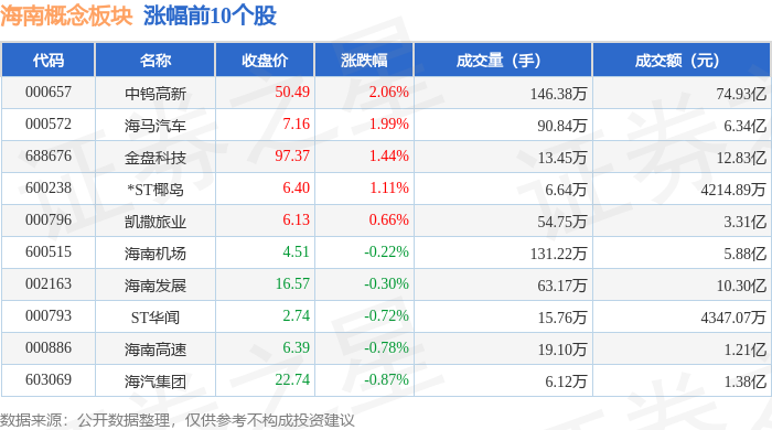 证券之星消息,1月27日海南概念板块较上一交易日下跌0.87%,中稀有色领跌。当日上证指数报收于4139.9,上涨0.18%。深证成指报收于14329.91,上涨0.09%。海南概念板块个股涨跌见下表: