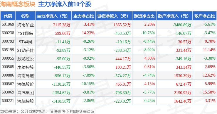 从资金流向上来看,当日海南概念板块主力资金净流出18.63亿元,游资资金净流入5.14亿元,散户资金净流入13.5亿元。海南概念板块个股资金流向见下表: