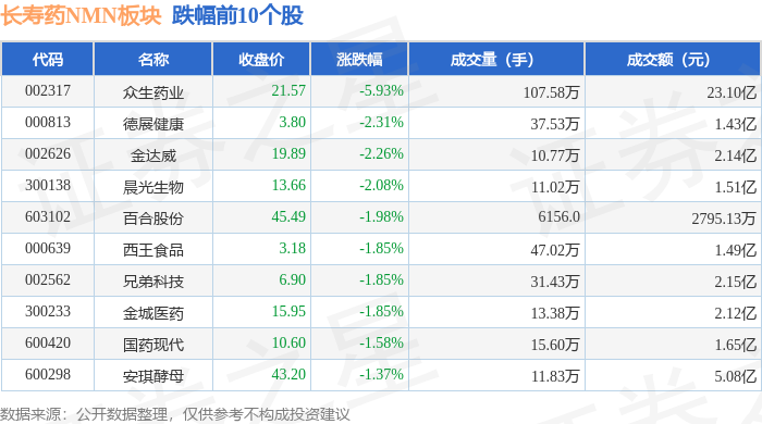 证券之星消息,1月27日长寿药NMN板块较上一交易日下跌1.33%,众生药业领跌。当日上证指数报收于4139.9,上涨0.18%。深证成指报收于14329.91,上涨0.09%。长寿药NMN板块个股涨跌见下表: