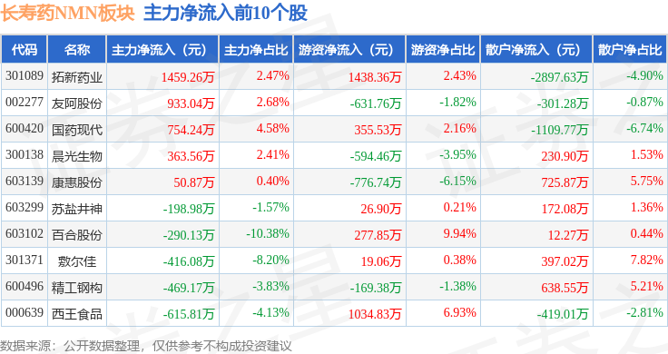 从资金流向上来看,当日长寿药NMN板块主力资金净流出5.3亿元,游资资金净流入2.54亿元,散户资金净流入2.76亿元。长寿药NMN板块个股资金流向见下表: