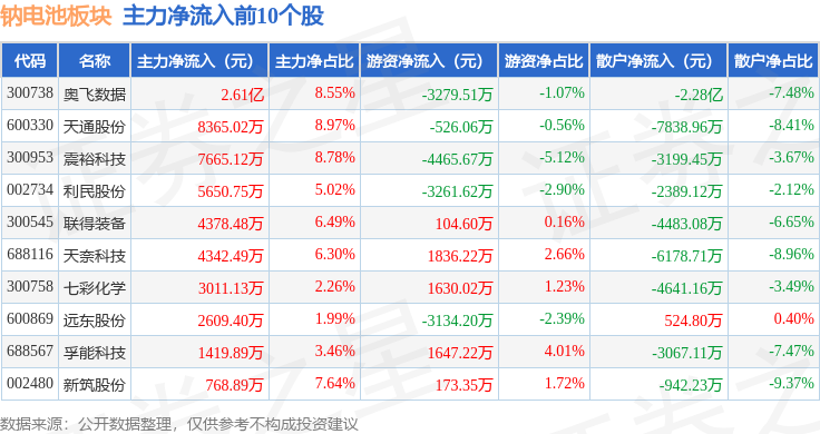 从资金流向上来看,当日钠电池板块主力资金净流出56.03亿元,游资资金净流入8.48亿元,散户资金净流入47.56亿元。钠电池板块个股资金流向见下表: