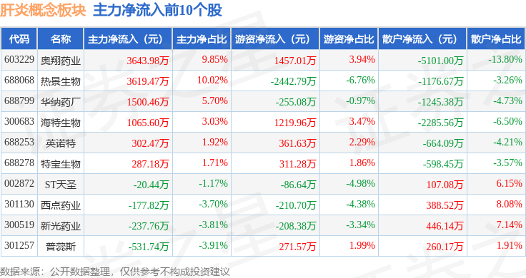 从资金流向上来看,当日肝炎概念板块主力资金净流出8.86亿元,游资资金净流入4.42亿元,散户资金净流入4.44亿元。肝炎概念板块个股资金流向见下表: